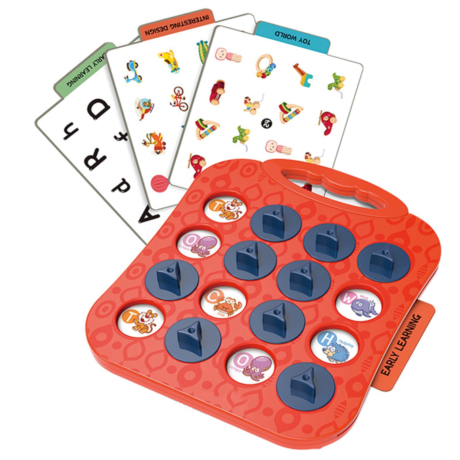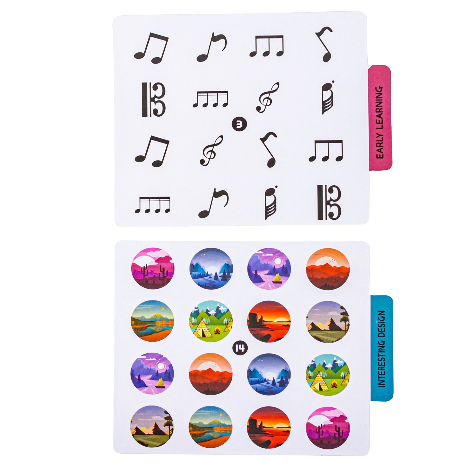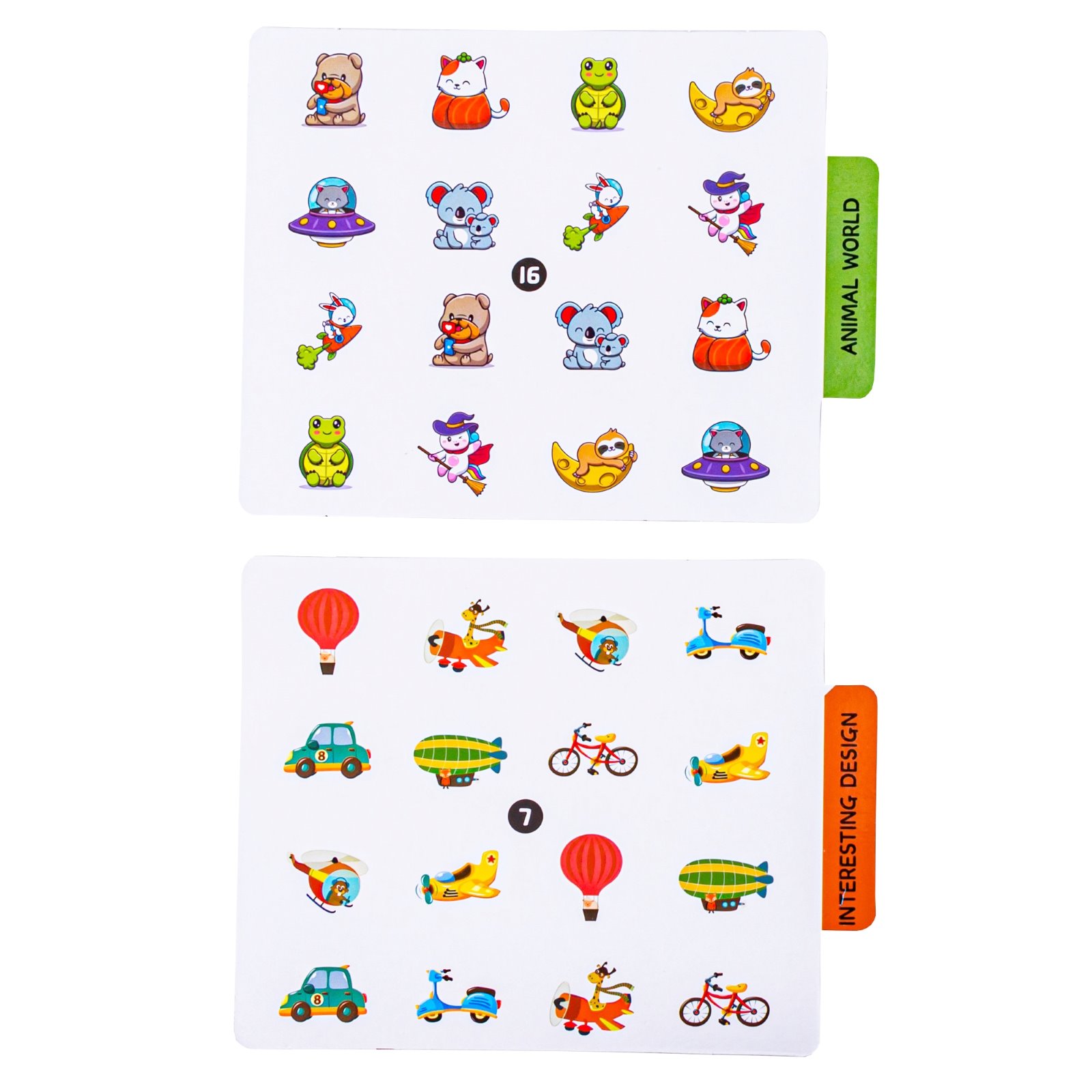 Zestaw zawiera dwustronne plansze, każda z inną tematykę – od zwierzątek, przez ubrania i zabawki, aż po pojazdy, literki, owoce i krajobrazy.